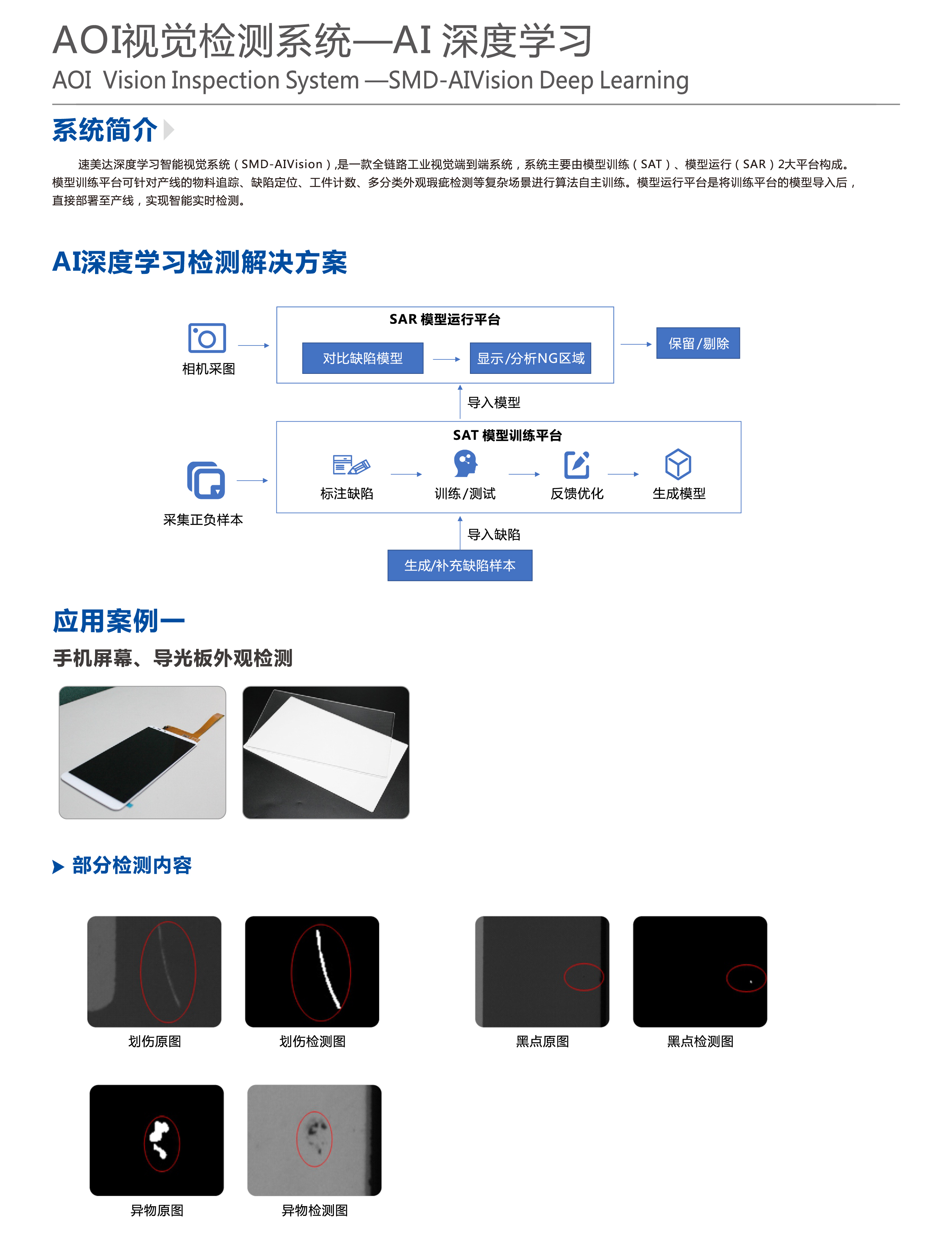 速美達(dá)深度學(xué)習(xí)智能視覺(jué)系統(tǒng) (SMD-AIVision),是一款全鏈路工業(yè)視覺(jué)端到端系統(tǒng),系統(tǒng)主要由模型訓(xùn)練 (SAT) 、模型運(yùn)行 (SAR) 2大平臺(tái)構(gòu)成。模型訓(xùn)練平臺(tái)可針對(duì)產(chǎn)線的物料追蹤、 缺陷定位、 工件計(jì)數(shù)、 多分類(lèi)外觀瑕疵檢測(cè)等復(fù)雜場(chǎng)景進(jìn)行算法自主訓(xùn)練。 模型運(yùn)行平臺(tái)是將訓(xùn)練平臺(tái)的模型導(dǎo)入后, 直接部署至產(chǎn)線,實(shí)現(xiàn)智能實(shí)時(shí)檢測(cè)。