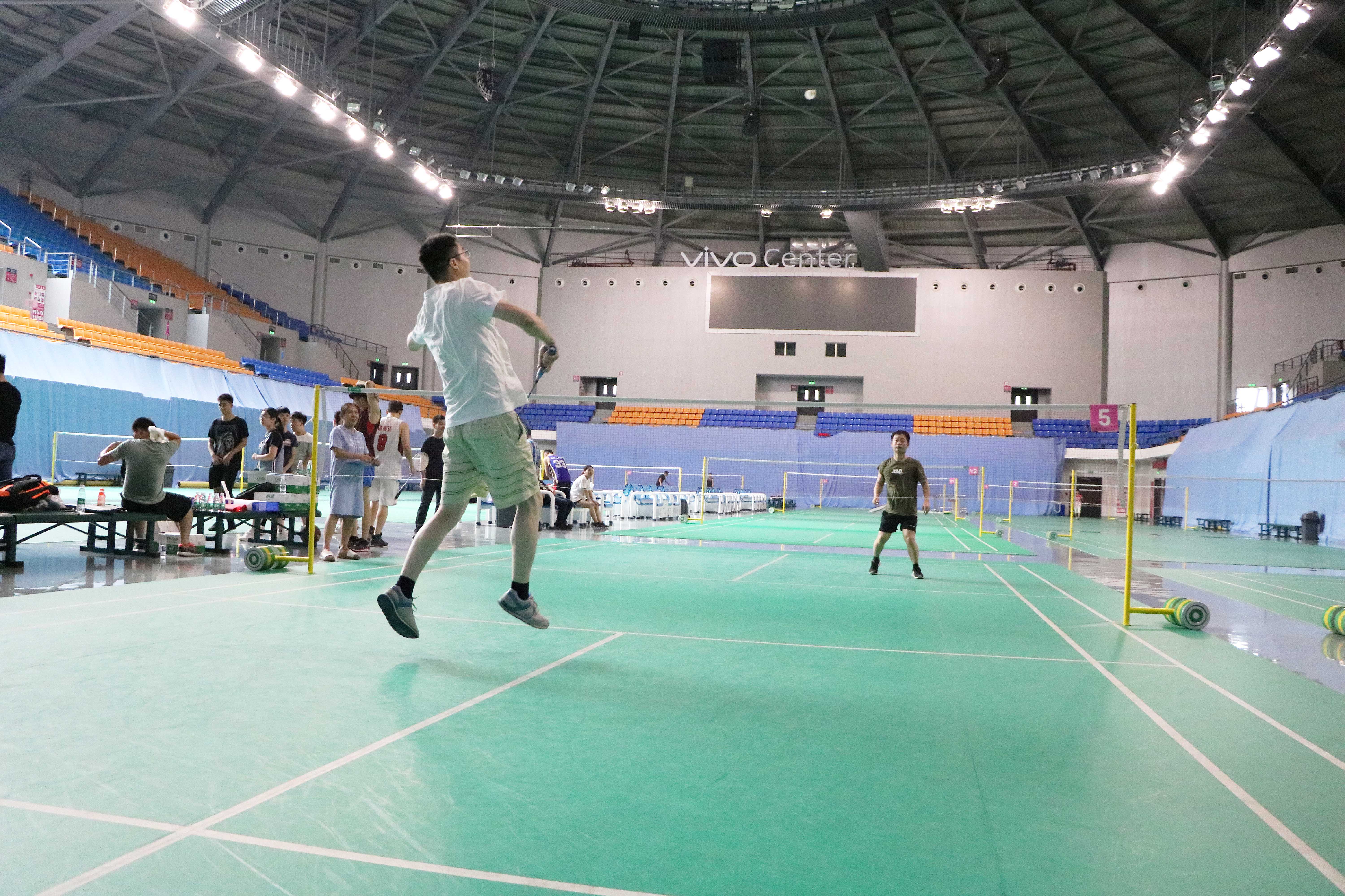 首先開始的是羽毛球男子單打,參加此項(xiàng)比賽的員工共計(jì)32人。參賽選手以著最飽滿的精神態(tài)度進(jìn)行對(duì)決,選手有力地?fù)]舞著羽毛球,羽毛球在體育館上空飛揚(yáng),加油吶喊聲此起彼伏。